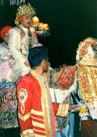 派手派手の白馬に乗って新郎新婦登場