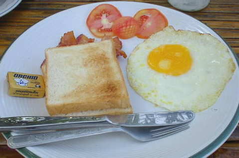 HOME>Thailand>タイのご飯>朝食セット 南の島編 4/11 コパンガンの泊まってたバンガローの朝食セット。 海を見ながら食べる。紅茶かフレッシュジュースが合う。 たまにこんな朝食もいい。 BACK TOP NEXT e-mail: はのまん@沈没旅行者