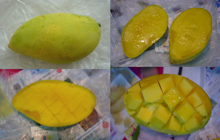 HOME>Thailand>タイのご飯>マンゴー バンコク編 27/27 マンゴー 左上:マンゴーです。右上:種に沿って3枚におろすように切る。左下:格子状に切れ目を入れる。右下:皮の方から上に押し上げる。そのままカブリ! ズルズル音を立てて食べるのがおいしい。果物の女王様かな?タイでは青いマンゴーも食べる。マンゴーもいろいろ種類があってそれぞれ味が違う。 BACK TOP NEXT e-mail: はのまん@沈没旅行者