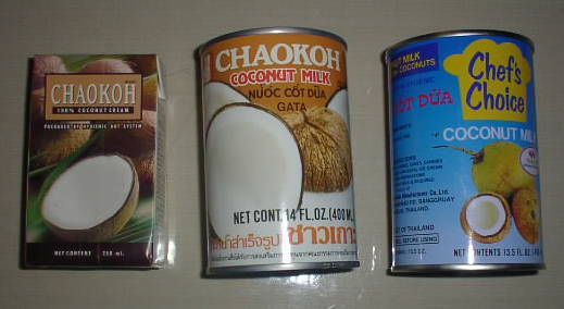 HOME>旅の雑学ノート>タイカレー>ココナッツミルク ココナッツミルク&クリーム 左のパックがココナッツクリーム。 右側の青い缶のはよく日本で見かけます。 BACK TOP NEXT e-mail はのまん@沈没旅行者