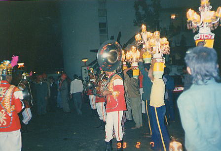 夕闇に頭にあかりを乗せた人達、そして楽団が続く