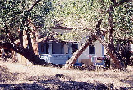 HOME>India>ゴアフォトアルバム>No,3/12 ゴアの我が家。 手前に見える青いところが玄関。 いつも家の中でなくここの玄関でくつろいでいる。 前の木にはリスがたくさんいる。 家のまわりは、豚、山羊、牛などが散歩しにくる。 BACK TOP NEXT e-mail はのまん@沈没旅行者