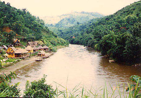 HOME>Thailand>タイ、最北の町へ>国境の川 No,10/14 国境の川 メサイの西側の端右側はビルマ、左側はタイ。川幅20メートルのこの川が国境なのだ。もちろん言葉も人も文化も異なった国なのだ。左に見えてるバンガローはメサイゲストハウス。 BACK TOP NEXT e-mail はのまん@沈没旅行者