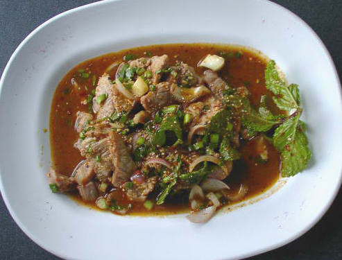 HOME>Thailand>タイのご飯>ナムトック バンコク編 13/27 ナムトック 軽くあぶった肉を辛いたれにあえてある。 酸味のきいたたれに香辛料がぴりっと効いている。 酒のつまみによくあいそう。 BACK TOP NEXT e-mail: はのまん@沈没旅行者