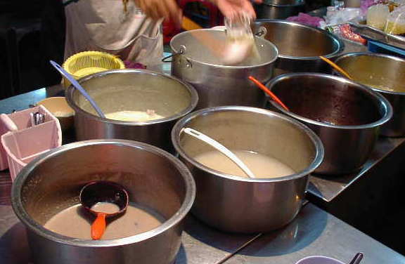 HOME>Thailand>タイのご飯>おしるこの屋台 バンコク編 20/27 おしるこの屋台。 食後のデザートに、夜中に何か甘い物が欲しくなったときに。 その場で食べてもいいし、袋に入れてもらい後からこっそり。 おしるこも日本のと味は違うがまたおいしい。 いろいろな種類のが有る、自分の好みの味の物が必ずあるはず。 うーんまよってしまう。 BACK TOP NEXT e-mail: はのまん@沈没旅行者