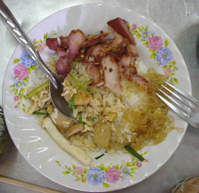 HOME>Thailand>タイのご飯>ぶっかけご飯 ぶっかけご飯、楽宮ホテルの裏の屋台。 ご飯の上にいろいろなおかずを乗せてくれる。いろいろなおかずがあり好きな物をのせてくれる。おかずが2種類で20バーツ、3種類30バーツ。いつも何を選ぶか迷ってしまう。お昼の定番メニュー。 BACK TOP NEXT e-mail: はのまん@沈没旅行者