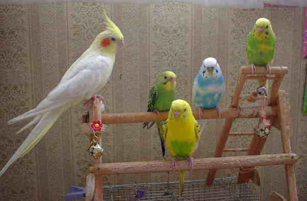 HOME>Note>旅は鳥ずれ>鳥さん達 右からセキセイインコのキスケ,ソムちゃん、ピーちゃん、カップ君、オカメインコのみかんちゃん。キスケとカップ君はソムちゃんとピーちゃんの子供です。いつも枕元においた止まり木の上で夜一緒に寝てます。鳥かごは餌を食べるときと外でひなたぼっこをするときにはいる位です。 BACK TOP NEXT e-mail: はのまん@沈没旅行者