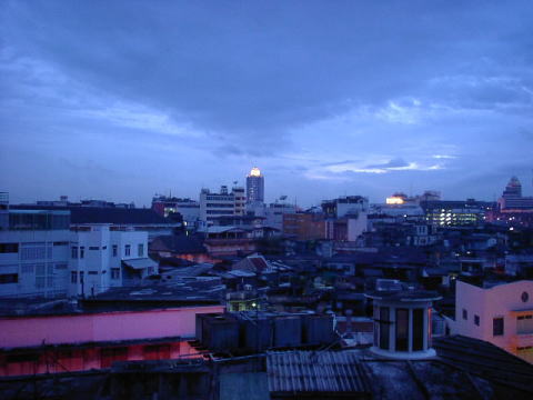 HOME>Thailand>楽宮、ジュライ、スリクルン>黄昏のバンコク バンコクトワイライト 8月、夕方になると毎日スコールが降りました。晩ご飯は外に食べにいけるかな?それともホテルで食べようか?赤く染まる夕焼けではなく何となく寂しい感じのバンコク。雨が降りそうな天気、黄昏のバンコクスリクルンホテル618号室からの眺め 目次へ 次の写真へ E-mail ハノマン@沈没旅行者