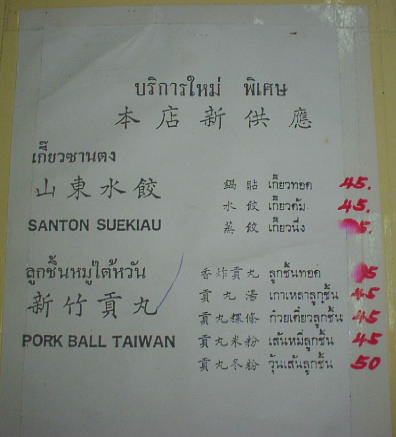 HOME>Thailand>楽宮、ジュライ、スリクルン>スリクルンのメニュー スリクルンのレストランのメニュー ここの水餃子(キャオトム)がおいしい。 ほかにカニチャーハン(カオパットプー)もおいしい。 行ったらついでにいかが? BACK TOP NEXT e-mail はのまん@沈没旅行者